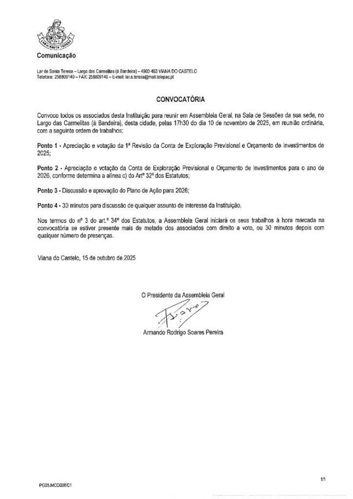 Convoco todos os associados desta Instituicao para reunir em Assembleia Geral, na Sala de Sessões da sua sede, no Largo das Carmelitas (a Bandeira), desta cidade, pelas 17h30 do dia